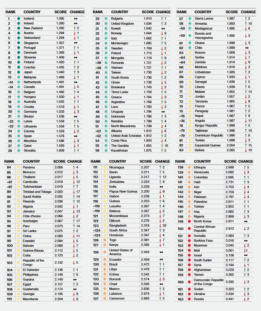 "Най-немирните" държави в света също са в Източна Европа. На последно място е класирана Русия (163), а на предпоследно Украйна (162). На дъното в класацията са още Судан (161), ДР Конго (160), Йемен (159), Афганистан (158), Сирия (157), Южен Судан (156), Израел (155) и Мали (154).
