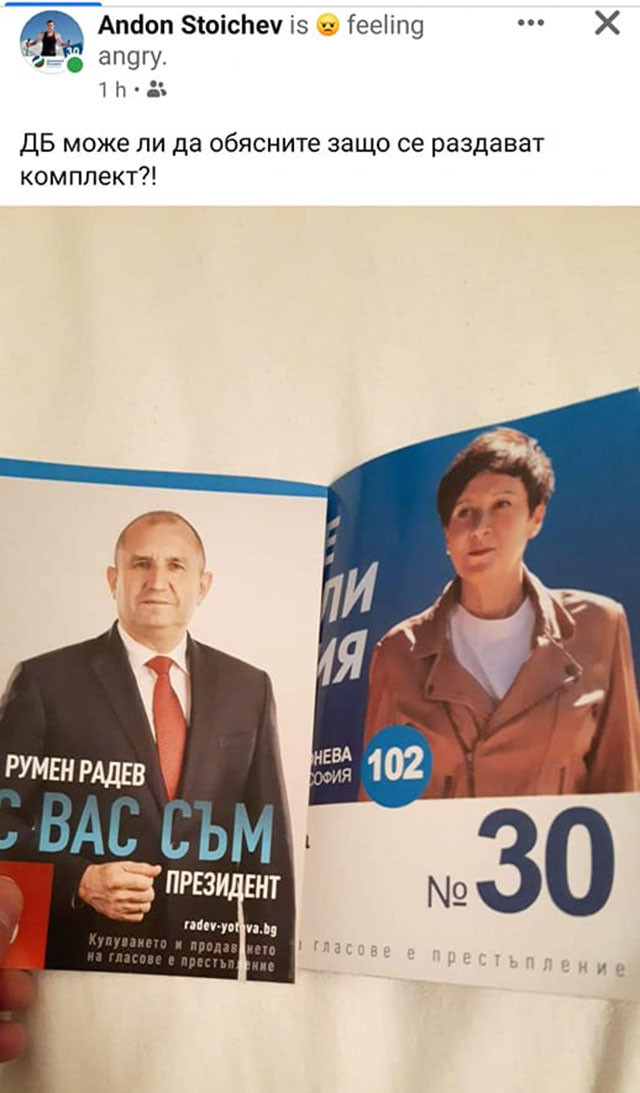 „От стоянките на Демократична България раздават тези брошури заедно. Нищо странно, според мен, но самият актив на ДБ почва да се чуди и дразни. Май им увира в главата, че кандидатурата на Лозан и бясната либералка беше умишлен фарс, а формацията реално си е продала отдавна онова на Радев“, съобщава авторът на поста.