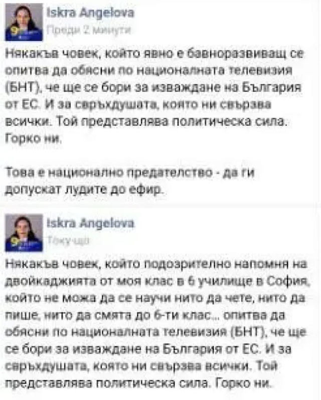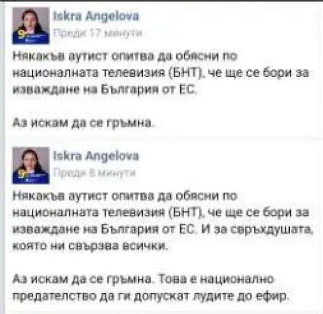„Някакъв аутист опитва да обясни по националната телевизия (БНТ), че ще се бори за извеждането на Българя от ЕС”, гласи първоначалният пост на представителката на ПП, след това няколко пъти редактира написанато като към него добавя, че иска „да се гръмне”.