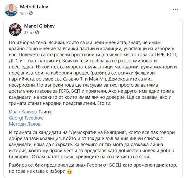 Същото става и с Методи Лалов, който сподели пост на своя приятел Манол Глишев. В него известния протестър сипе хули срещу леви, десни, „чалгаджии“ и слага под общ знаменател като „фалшиви партийции“ Слави Трифонов и Мая Манолова.