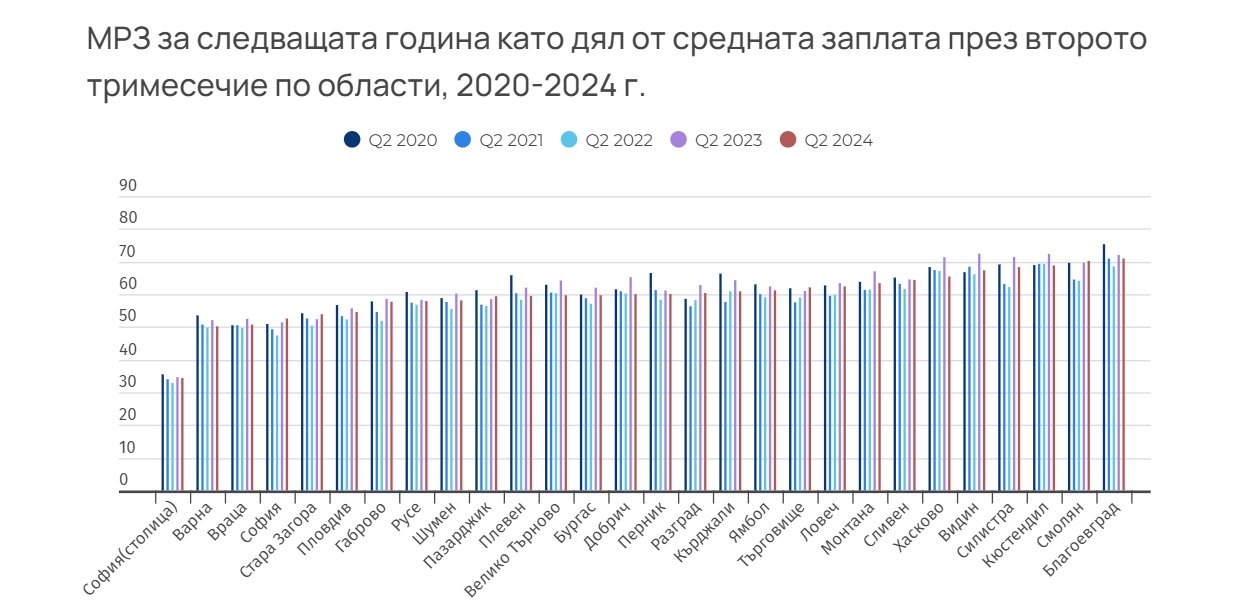 Значителните различия между регионите в съотношението между средната и минималната заплата остават, но без големите промени през последните няколко години. Към второто тримесечие на 2024 г. покритието е най-високо в Благоевград - 71%, както и в Смолян - 70%, а с над 60% отношение на МРЗ към СРЗ са 15 от областите в страната. Под 50% е това отношение единствено в столицата, а най-близо до средните за страната 50% са Варна и Враца. Ако погледнем към основните икономически отрасли, покритието на СРЗ с новата МРЗ е 21% в ИКТ, 32% в енергетиката, 33% в енергетиката, 35% в професионалните дейности, до 72% в хотелите и ресторантите и 65% в селското стопанство. Трябва да имаме предвид, че заради продължаващия ръст на заплатите покритието към края на годината тези отношения ще са малко по-ниски.