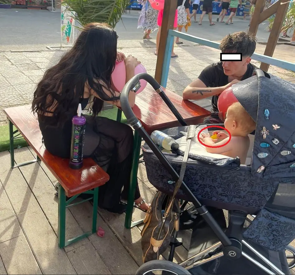 Млада жена диша балон с райски газ в центъра на Созопол. В същото време до нея в количка стои малко бебе и младо момче. Снимката обикаля главоломно мрежата, а възмутени хора коментират, че това се случва в центъра на Созопол.