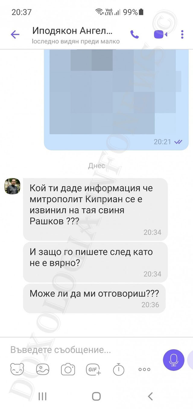 „Кой ти даде информация че митрополит Киприан се е извинил на тая свиня Рашков??? И защо го пишете след като не е вярно? Може ли да ми отговориш??? Ти провери ли тази информация дали е вярно? Ако митрополита е искал да се извини той щеше да го направи публично и митрополита си стои твърдо зад думите които е написал вчера. Рашко може всичко да каже, но щом няма публична изява на владиката за извинение значи няма такова нещо. Да, извинение не е имало.“
