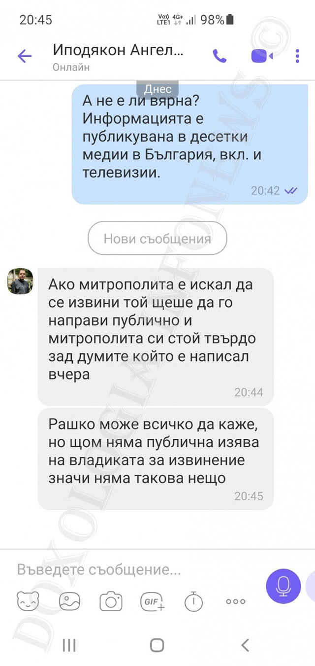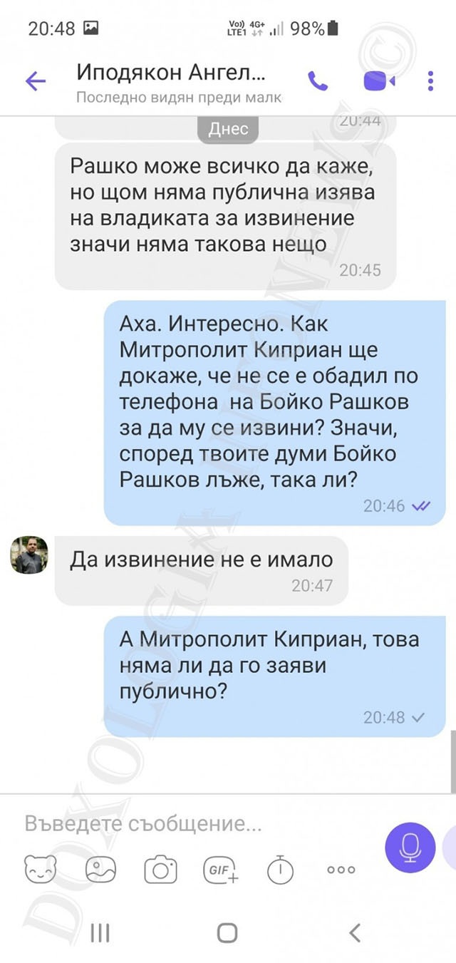 От думите на иподякон Георгиев ясно личи колко е ядосан от поредната лъжа на Бойко Рашков, който не само, че опита да вкара църквата в политическите игри на Румен Радев срещу ГЕРБ, но и най-безцеремонно е излъгал за извинение от страна на Митрополит Киприан, каквото очевидно не е имало. Разбира се, това е поредната манипулация от страна на служебния министър, който първо говореше за десетки подслушвани кандидат-политици, после, че от ГЕРБ ядат хора, сетне си позволи дни преди изборите да обвини партията в купуване на гласове, а в същия ден, вече развихрил се от медийното внимание, което никак не му липсва, реши да обяви, че Бойко Борисов има сделка с църквата и затова давал пари за ремонти и реставрации./tribune.bg