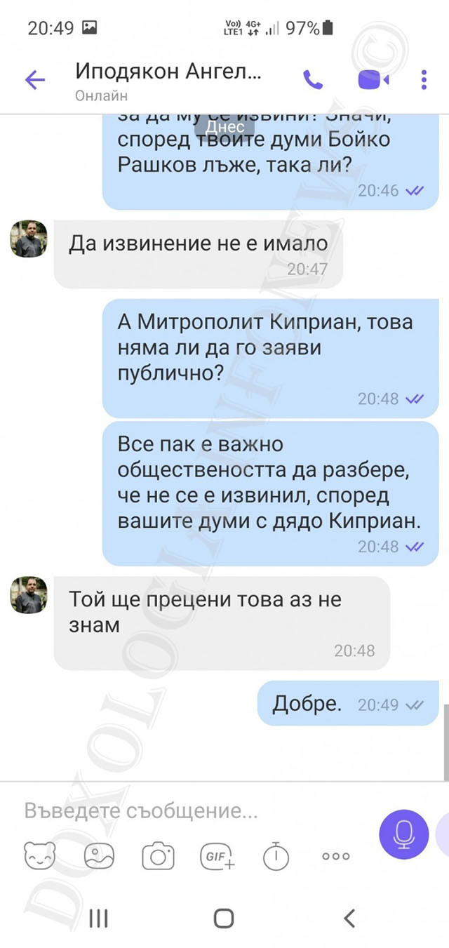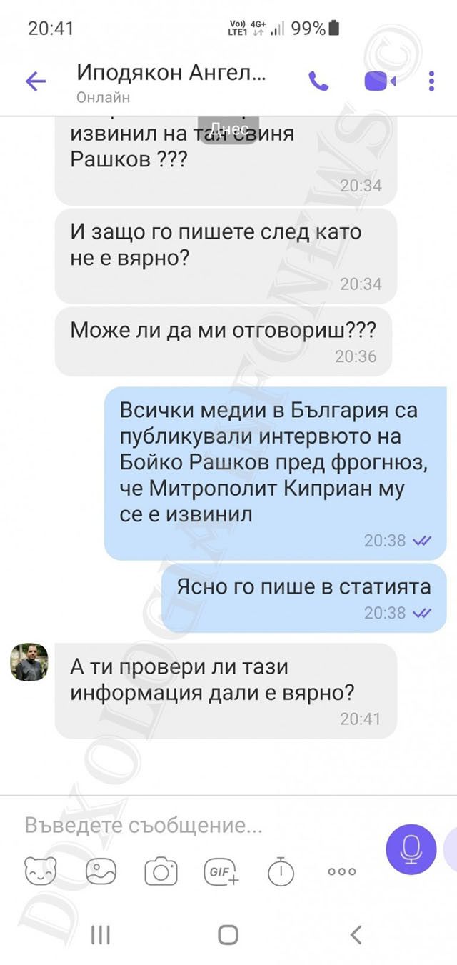 Служебният вътрешен министър Бойко Рашков споделил пред сайта „Фрогнюз“, че Митрополит Киприан му се обадил, за да се извини, защото бил разбрал думите му погрешно. Истината обаче се оказва съвсем друга. Сайтът Doxologia Infonew, който пише основно религиозна тематика публикува снимки от разговор между главния редактор на медията Йордан Георгиев и деловодителя на старозагорския митрополит, иподякон Ангел Георгиев. От разменените съобщения става ясно, че митрополит Киприан не само не се е извинявал, но и очевидно никога не е имал това намерение.