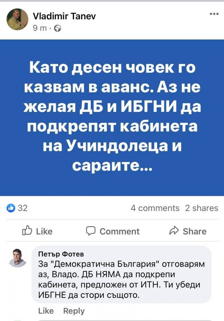 Не закъснява и коментар от Петър Фотев, който пък пише: За "Демократична България" отговарям аз, Владо. ДБ НЯМА да подкрепи кабинета, предложен от ИТН. Ти убеди ИБГНЕ да стори същото.