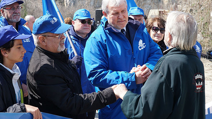 Председателят на СДС Румен Христов и зам.-председателят на СДС д-р Янко Станев поздравяват Кольо Вутов по време на поколонението на 26 март 2022 г. Снимка: Архив СДС-Варна