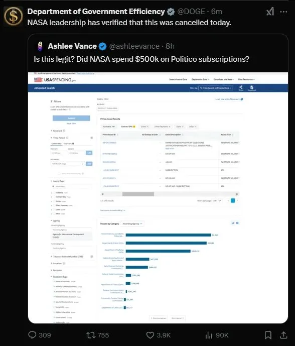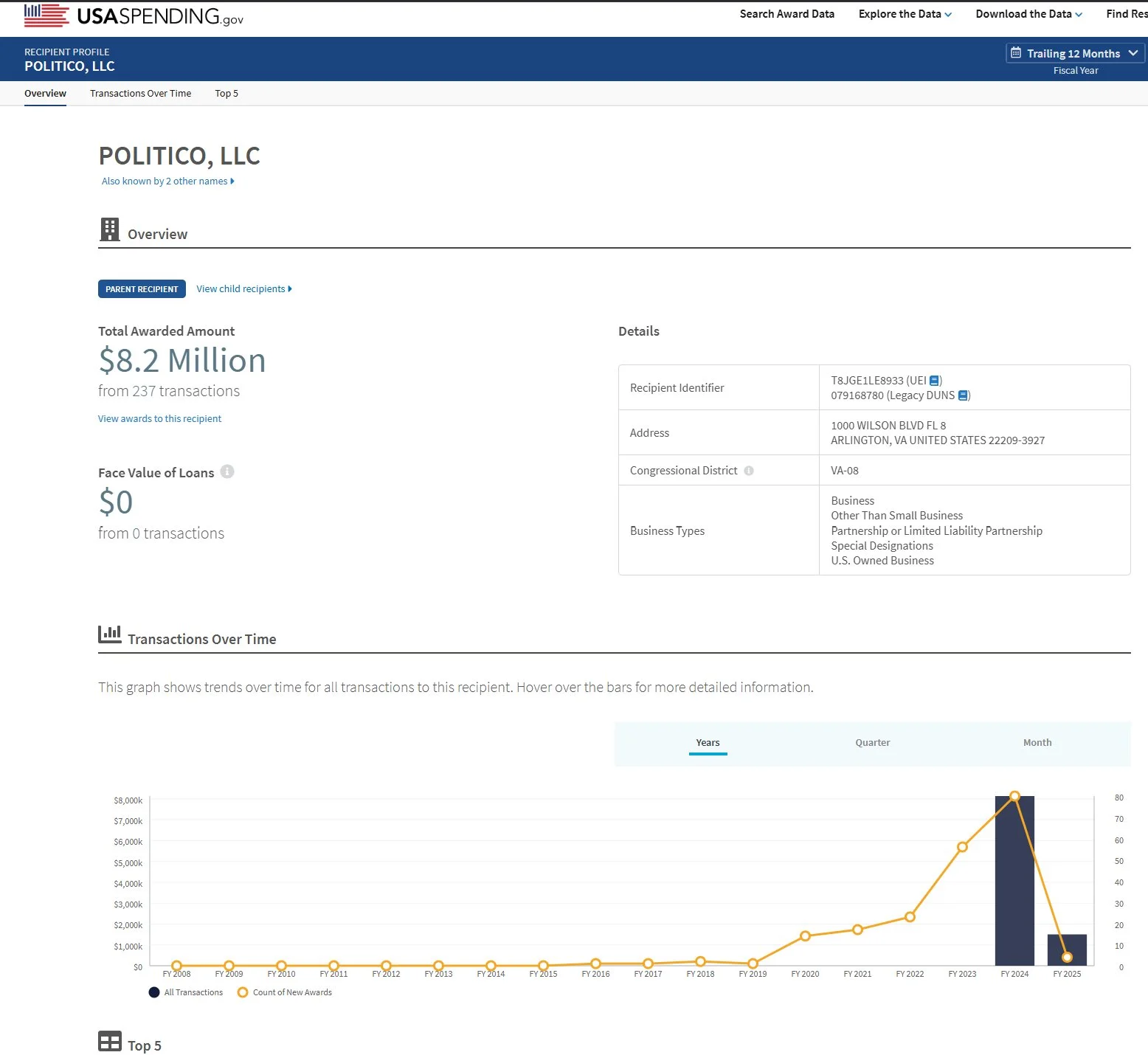 Би било прекрасно Политико да се грижи за България, нали? Да, ама има и друга причина. Оказва се, че Политико имат финансиране от американското правителство на обща стойност около 8,2 милиона долара. Това финансиране е предимно за тяхната платена версия, която струва към 10,000 долара на година. Навсякъде в правителството на САЩ се открива, че имат абонамент към платената версия на Политико. НАСА, космическата агенция, отброявала по 500 хиляди долара годишно за платен абонамент. Защо, за бога, и е на НАСА абонамент за новините в Политико!?