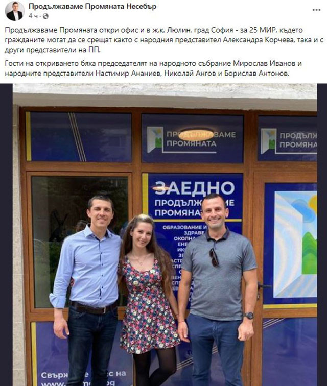 В него те пишат, че приемната е за среща на гражданите както с народния представител Александра Корчева, така и с други представители на ПП.