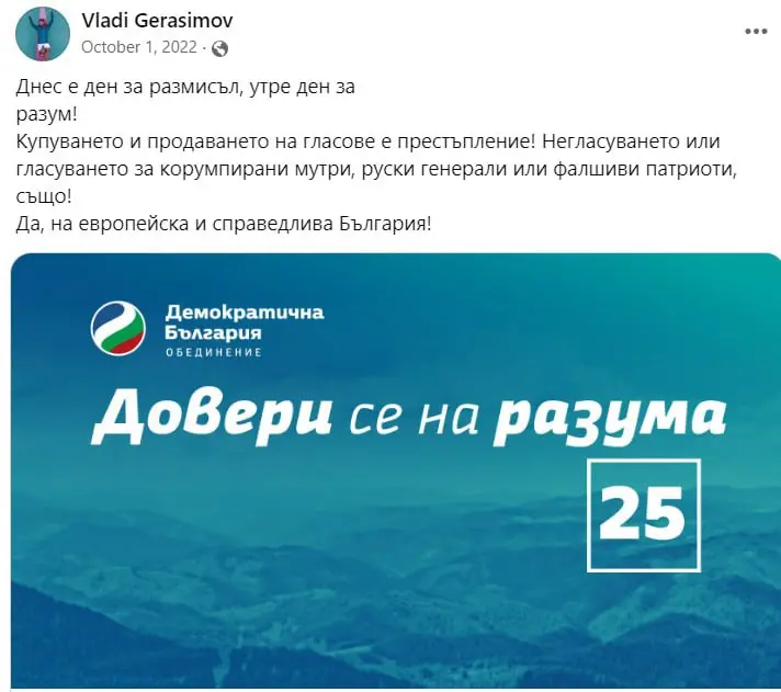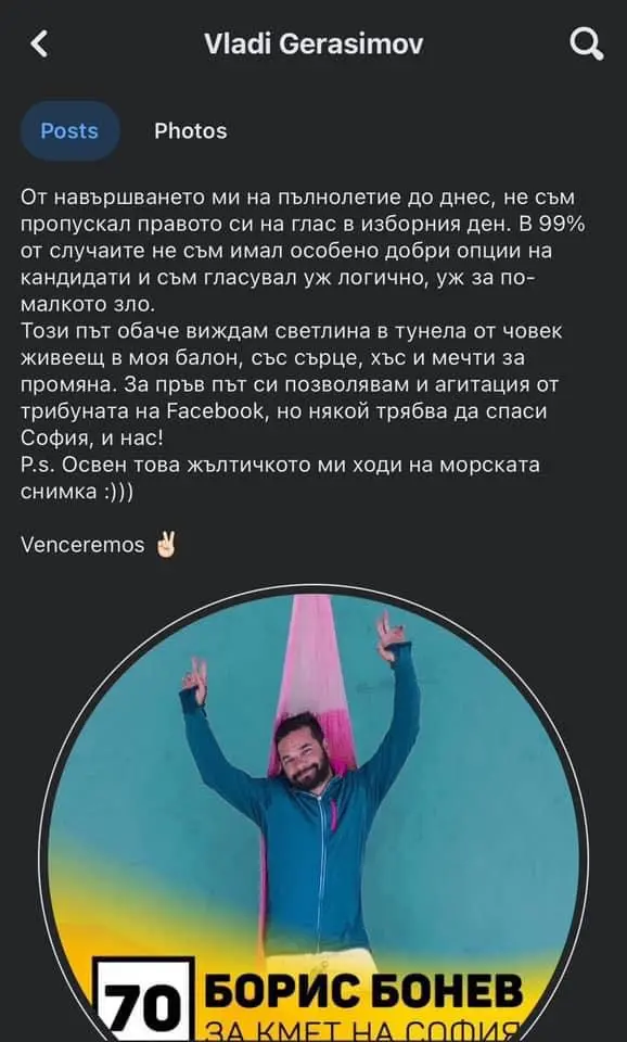 От профила на автора в социалните мрежи неприкрито личи, че е поддръжник на „Да, България“, за които агитира преди парламентарни избори.