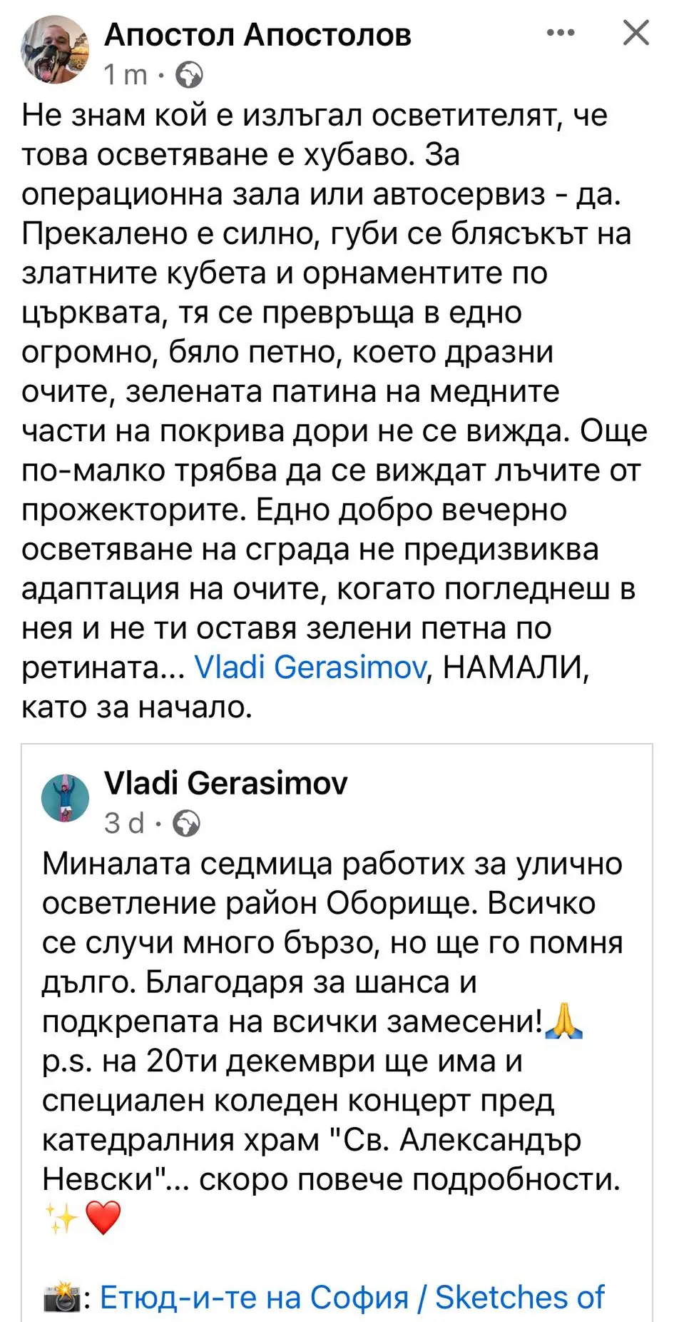Междувременно Фейсбук потребители със задоволство отбелязаха, че пластмасовият орнамент вече е свален, а други критикуват неудачното осветление на храма, дело на същия творчески екип.