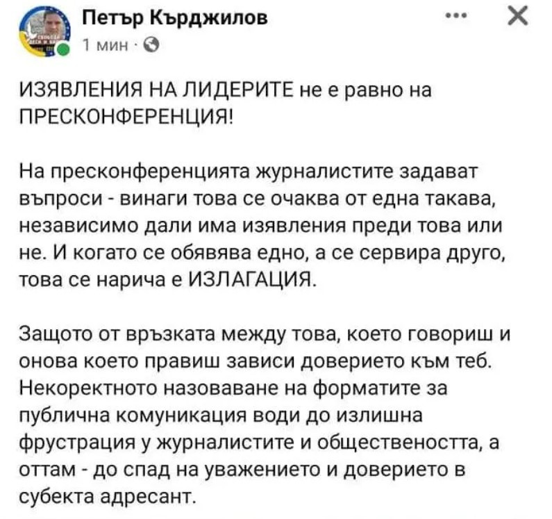 Пет дни след изборите ПП-ДБ обявиха пресконференция за медиите. Такава обаче нямаше, защото четирима души в лицето на Кирил Петков, Асен Василев, Атанас Атанасов и Христо Иванов излязоха да кажат по две изречения, без нито един журналист да има възможност да зададе въпросите си. Имаше и представители на медии, които бяха изгонени със сила от залата.