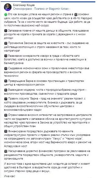 За пример по темата ще вземем платена публикация във Фейсбук на бившият областен управител на Варна Благомир Коцев. Човекът, чието семейство си е купило комплекс Хоризонт в Морската градина за жълти стотинки от тогавашните управляващи от ДеБъ (тогава все още ДСБ), който искаше да връща същата тази Морска градина на държавата, години наред лобира срещу спирането на колите в парка и блокира важна част от бюджета на града, връщайки решения приети с гласа на 2/3 от общинските съветници, днес е кандидат за народен представител от коалиция ПП-ДБ. Той е на почетното 8-мо място и имал собствени приоритети за Варна, които се въртят платено в мрежата. Ами да видим какво ни обещава: