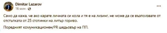 „Само да кажа, че ако карате личната си кола и тя е на лизинг, не може да се възползвате от отстъпката от 25 стотинки на литър гориво.