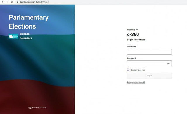 Това е страница, на която е поместена информация за протеклите на 4 април т.г. парламентарни избори в България. е-360 е Системата за управление на избори на Смартматик, адресът на DNS сървъра е 52.16.214.123, а по-долу е указано, че информацията се отнася за проведените на 4 април избори. Ако кликнете напред, ще стигнете до адреса, а там ви искат потребителско име и парола, за да влезете в самата система.