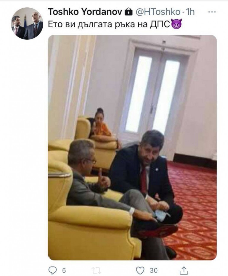 Втората снимка е от кулоарите на Народното събрание. Там на един диван са седнали Йордан Цонев от ДПС и Христо Иванов от „Демократична България“. Снимката е озаглавена „Ето ви дългата ръка на ДПС“