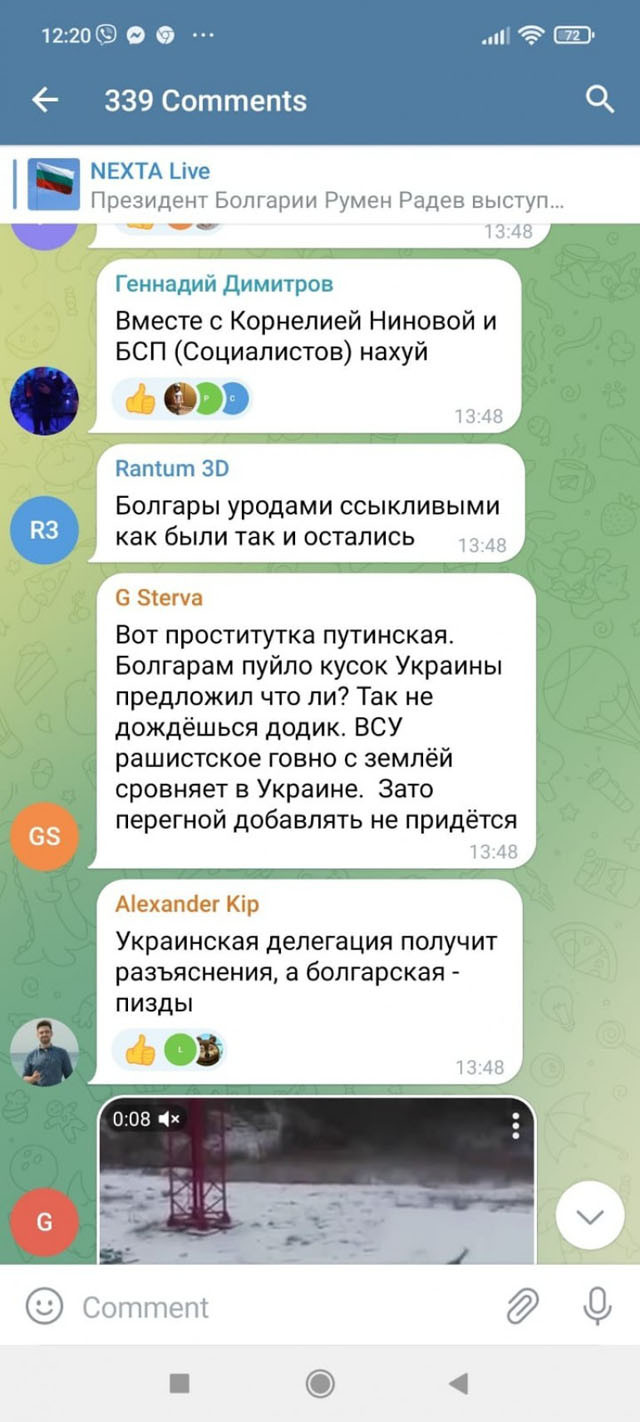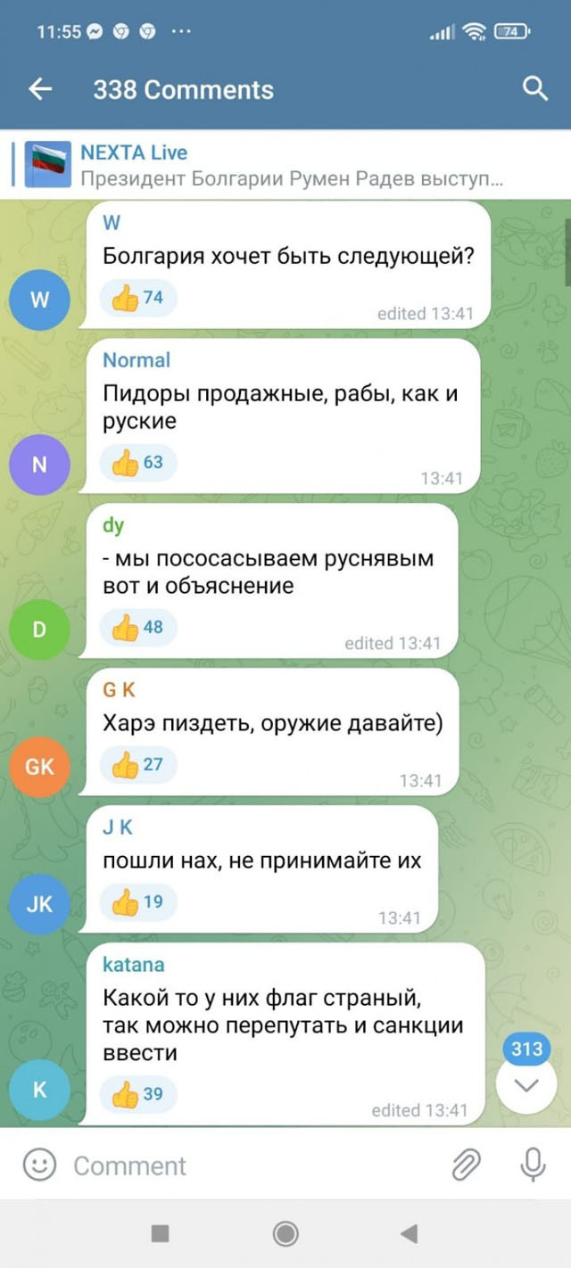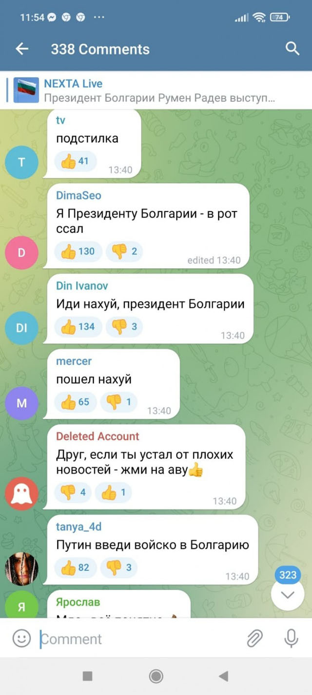 "Иди на*уй, президент Болгарии", пише един от потребителите на канала в коментар на изявлението на Радев.