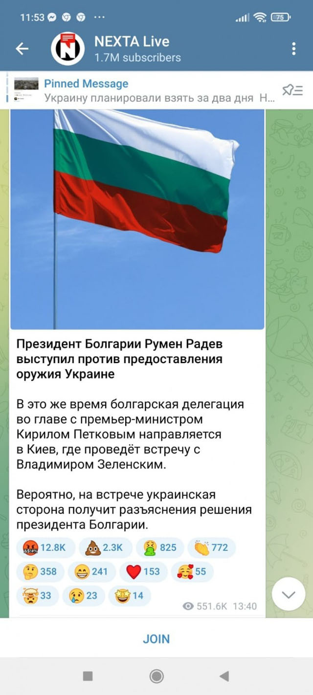 Думите на президента Румен Радев, че страната ни не трябва да предоставя оръжия за Украйна получи широк отзвук в медиите в Киев. Това става ясно от украински новинарски канали в "Телеграм" - NEXTA live.