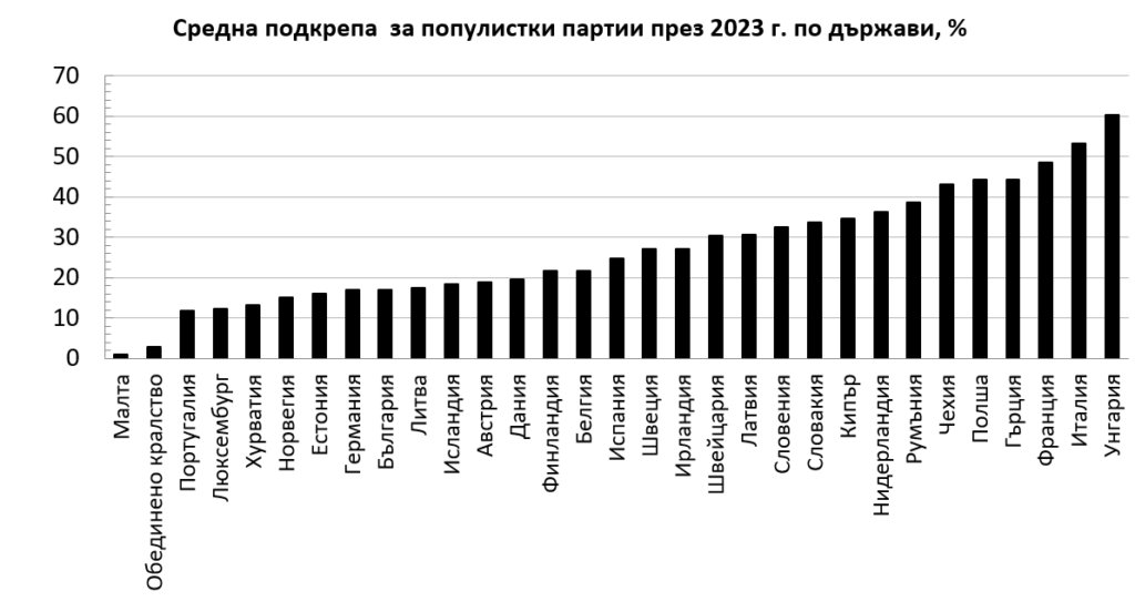 Петте държави в Европа с най-висока подкрепа за популистки и/или авторитарни партии са Унгария - с 60 %, Италия - с над 50 на сто, Франция - малко под 50 %, Гърция и Полша с близо 45 на сто.