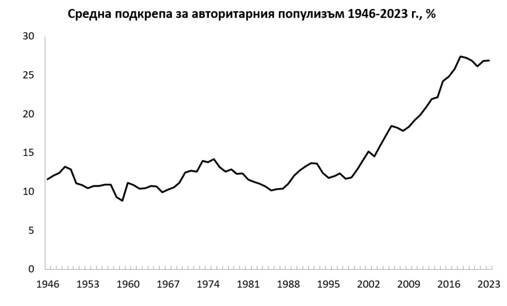 26,9% от европейците подкрепят авторитарни политически партии, както в лявата, така и в дясната част на политическия спектър. Въпреки че това представлява исторически най-високото ниво на подкрепа за тях, 2023 г. е пета поредна година без допълнителен ръст. България е на девето място сред държавите в ЕС със сравнително ниска подкрепа за подобен тип партии - под 20 на сто, но бележи ръст през последните 10 години.