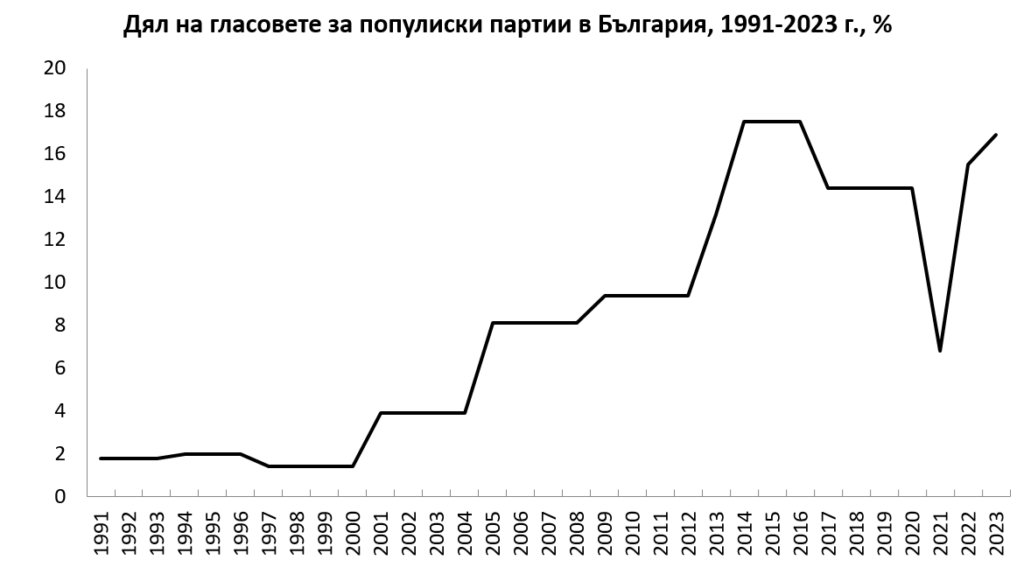 Изчисленият според методологията на индекса общ дял на гласовете за авторитарни и популистки партии в България бележи значителен ръст през последното десетилетие, като в средата на миналото десетилетие достига почти 1/5 от всички гласове на парламентарни избори. През последните години възходът на "Възраждане" й носи поредно увеличение, като според последното издание делът на популизма в страната достига 17% през 2023 г.