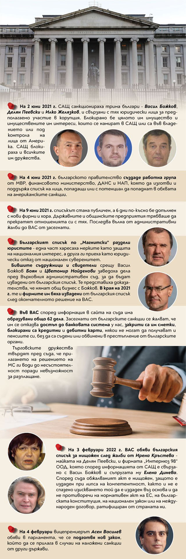 Според американските органи това публично обявяване на санкции е най-широкообхватното действие на глобалния закон “Магнитски”. Въпросите дали и какъв български вариант да има, станаха особено актуални преди седмица, когато ВАС обяви за нищожен “черния списък” по 2 дела, образувани по жалби на майката на Делян Пеевски - Ирена Кръстева, и на съпругата на Васил Божков - Елена Динева. Общо делата са 62, като най-вероятно ще завършат по сходен начин. Те са заведени от хора със запорирани сметки и спрян достъп до бизнес и услуги, попаднали в “черния списък”, съставен от българското правителство. Това са т.нар. свързани лица със санкционираните. Част от тях са посочени от САЩ, а други - от нашите власти след проверки в регистрите.