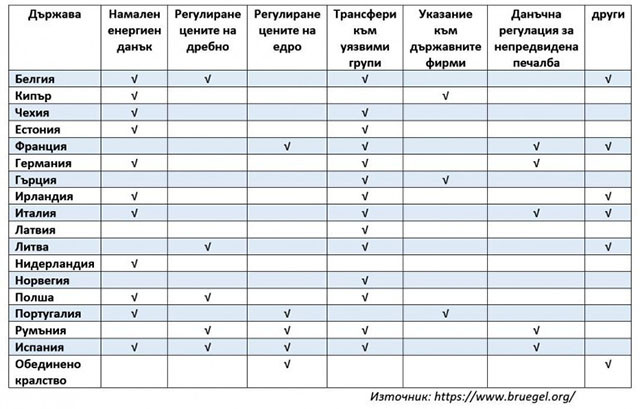 Таблицата по-долу класифицира мерките в 17 държави от ЕС и Обединеното кралство в 6 типа реакции на скока в цените на енергията. Всички мерки се предлагат или приемат от септември 2021 г., когато енергийната криза вече се разгръща.