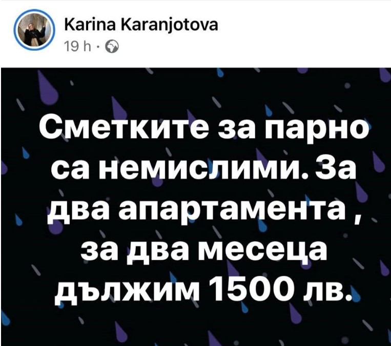 За непосилни сметки за парно сигнализираха журналисти във Фейсбук. По думите им за два месеца сумата, която трябва да изплатят на „Топлофикация” е 1500лв. Припомняме, че цената на парното тръгна драстично нагоре още в средата на миналата година. Тарифите бяха увеличени с близо 40%, а като основна причина се изтъкна цената на природния газ, който ползват топлофикациите.