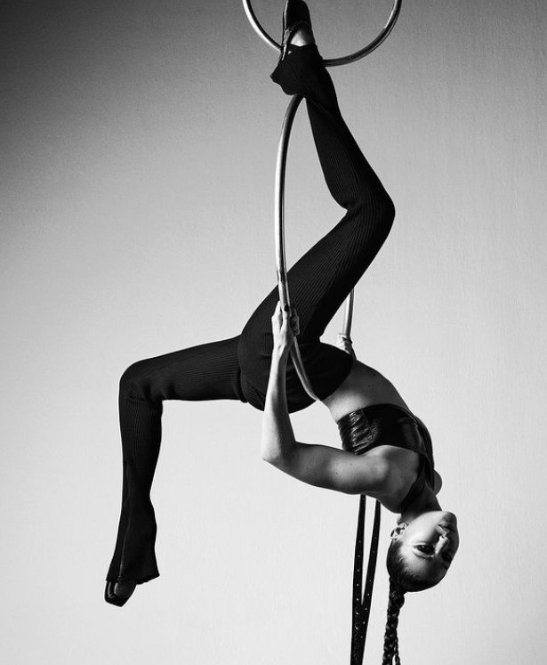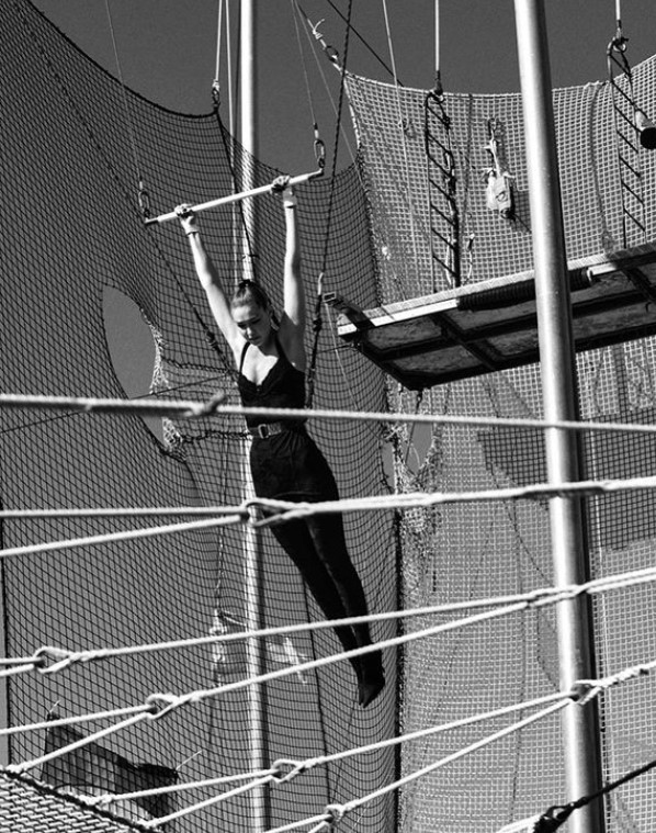 Джиджи обаче очевидно е по-силна от всякога. Или поне така изглежда на новия брой на списание V Magazine. Моделът краси корицата на пролетния брой на списанието и то по един много предизвикателен, интересен и безстрашен начин - като прави серия от акробатични номера на въздушен трапец.