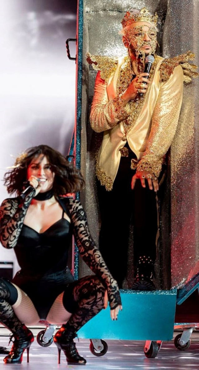 На конкурса той изнесе концерт, облечен както винаги екстравагантно като цар с корона и дълга мантия с избродиран елински бог.