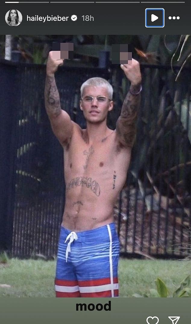 На кадъра Джъстин е без риза и носи шорти, а закачливата снимка e озаглавена от Хейли "mood" ("настроение").
