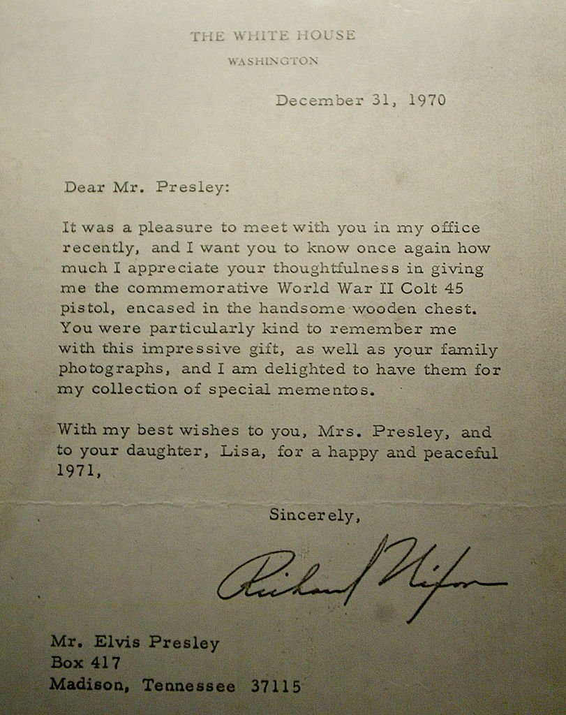 "Скъпи г-н Пресли, беше удоволствие да се срещна с Вас в офиса ми. Искам да подчертая още един път, че оценявам вашата загриженост и съм благодарен за подаръка, който ми направихте, а именно възпоменателен пистолет "Колт 45" от Втората световна война, прибран в красив дървен сандък. Бе много мило от ваша страна да ме уважите с подобен подарък и наред със снимките, ще бъдат прекрасно допълнение в колекцията ми със спомени от специални моменти", пише Ричард Никсън.