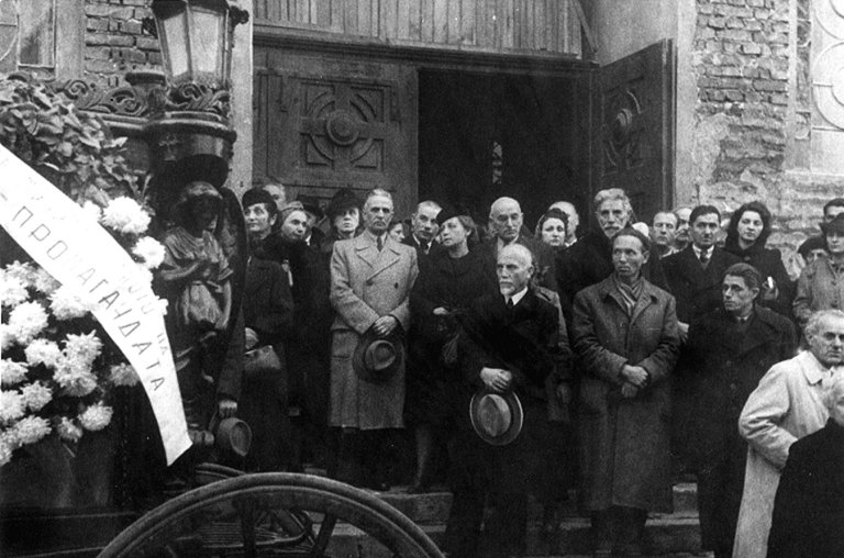 Поклонение и опело пред тленните останки на поета Кирил Христов. На снимката се виждат: Димо Казасов /в центъра с брадичката/, в дясно от него е Илия Бешков, зад Бешков е Георги П. Стаматов, в ляво до Казасов е съпругата на поета Кирил Христов Ноеми Молнарова, в ляво горе е Дора Габе. (Архив Пресфото -БТА)