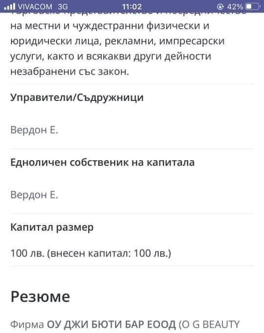 След проверка в търговския регистър обаче ясно се се вижда, че името му фигурира като управител и едноличен собственик на капитала на OG Beauty Bar - салонът, който Габи отвори малко след започването на "Ергенът". В документът е описан и внесеният капитал от футболиста, възлизащ на 100 лв.