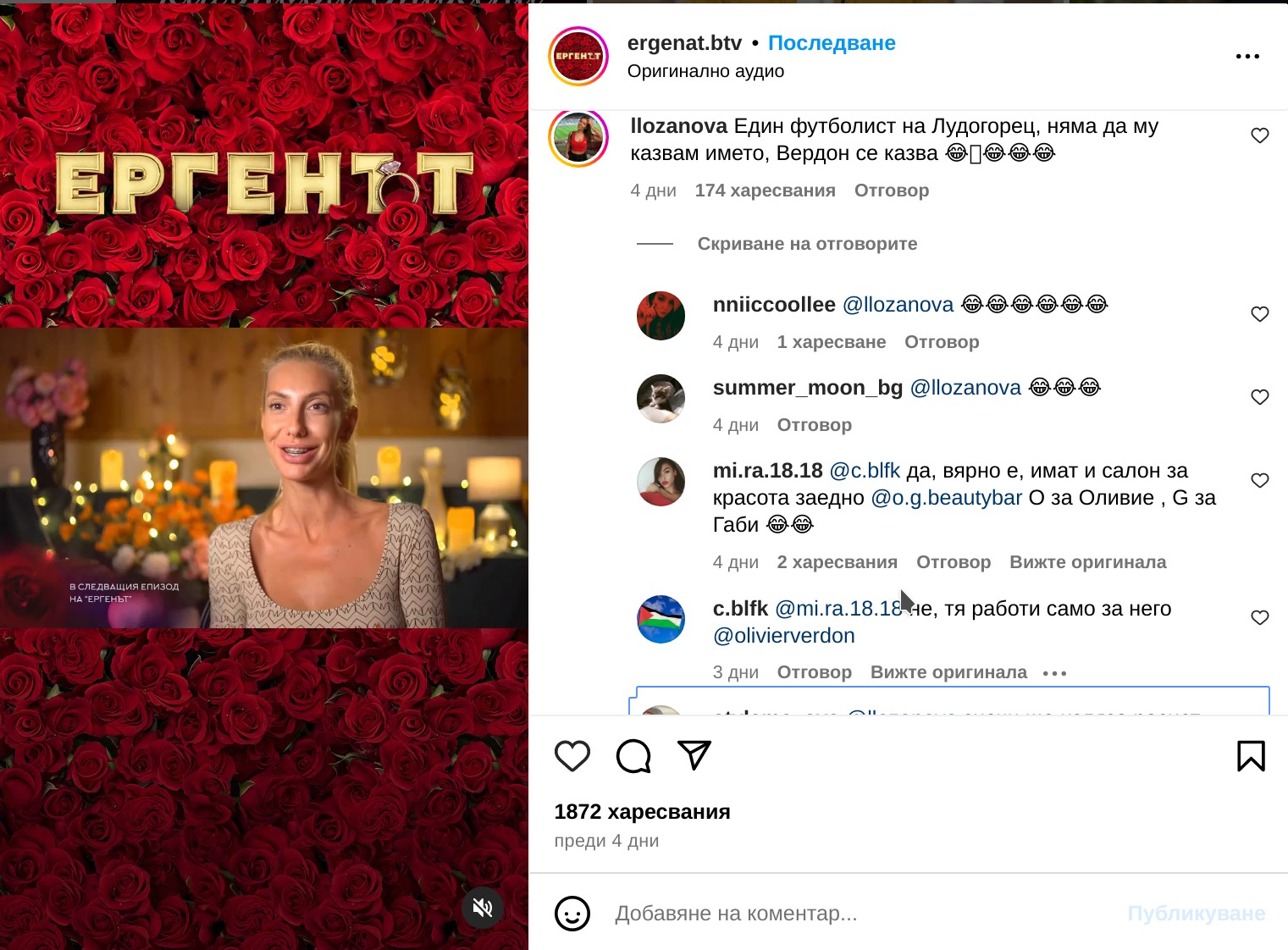 Асенова влезе в предаването с визитка, в която обяви, че работи като спортен мениджър в БФС и сподели на останалите, че има информация кой е мъжът до Габриела. Името му беше заглушено за зрителите пред екрана, но в онлайн пространството все по-упорито се говори, че това е футболистът на "Лудогорец" Оливие Вердон.