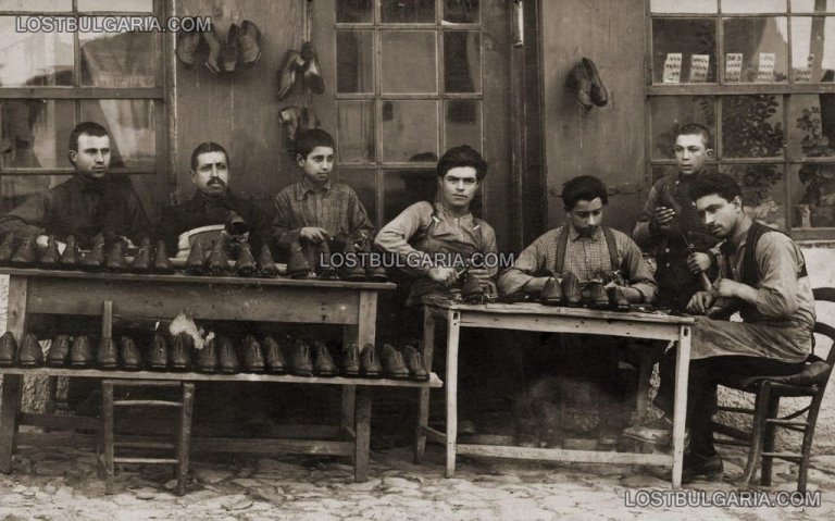 Майстор обущар с чираци пред работилницата си, 1924 г. Снимка: "Изгубената България"