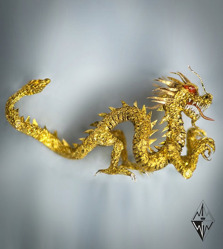 Скулпторът е изработил ръчно дракона с червени очи от едно-единствено късче злато. За да оформи извивките му, той е използвал микроскопична закалена стомана.