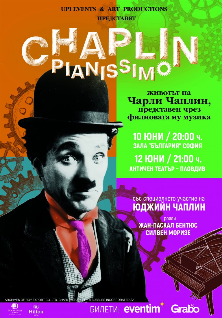 България също се включва в празнуването на великия комик с гастрола на легендарния концерт- спектакъл "CHAPLIN Pianissimo", който ще бъде представен на 10 юни в София в зала "България", на 12 юни в Античния театър в Пловдив, на 15 юни във Фестивалния комплекс във Варна в рамките на Международния театрален "Варненско лято".