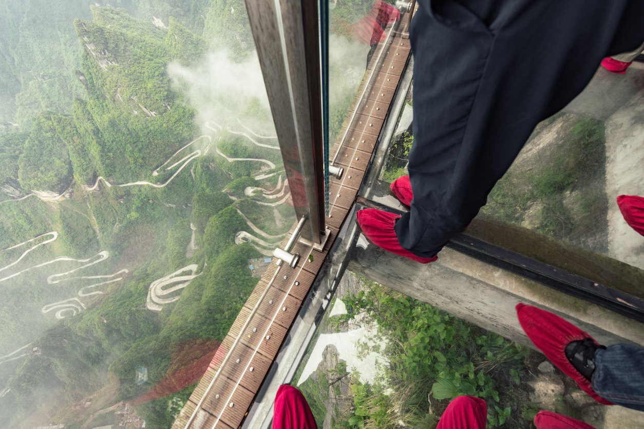 Бързо открих, че с многобройните си мостове със стъклено дъно и пътеки по ръбовете на скалите Тианмен не е за хора със слаби сърца. Чувах как сърцето ми бие силно, докато правех една след друга несигурните крачки по забуления в мъгла мост със стъклено дъно. Определено беше неподходящ момент Шай да посочи, че тази пътека първоначално се е наричала "Алея на вярата". Видимостта остана слаба през цялата сутрин, но успях да видя слабите очертания на стълбове и върхове, много подобни на тези, които бяхме виждали в националния парк. А след това и към специалната част - пещерната арка между два хълма, която според китайската легенда е вратата към небето (оттук и местното име на планината Тян Мен Шан, или "Планината на небесната порта").