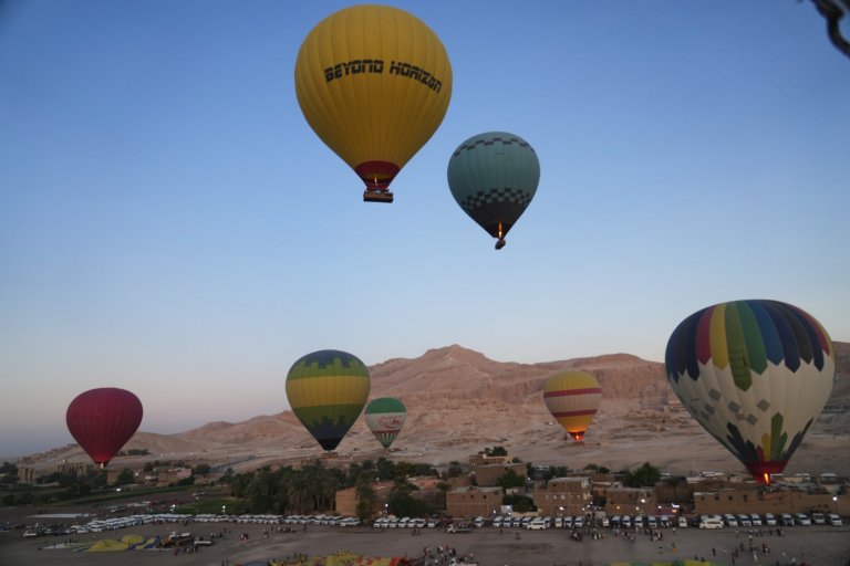 4 октомври 2025 г. Туристи прелитат с балон над Долината на царете в южния град Луксор, Египет, където гробницата на Аменхотеп III, управлявал древен Египет между 1390 г. пр.н.е. и 1350 г. пр.н.е., е отворена за посетители за първи път от повече от две десетилетия. Снимка: Amr Nabil/AP/БТА