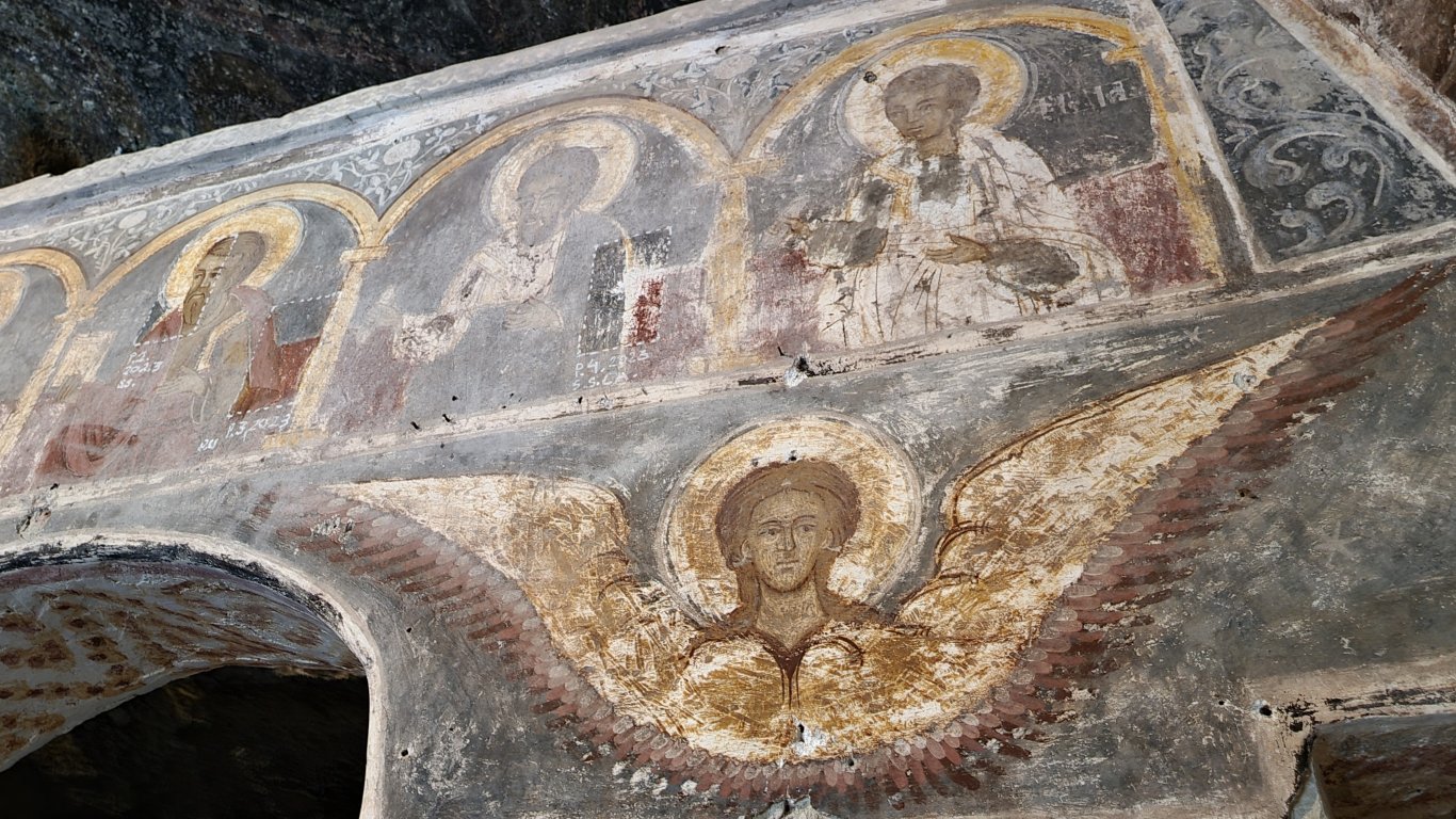 Стенописите в нея са оригинални и се смятат за най-старите в Румъния. Според оценки на експерти те са на около 700 г. Макар че заради високата влажност 80 процента от тях са увредени и нуждата от реставрация е спешна, все още ясно се различават изобразените сцени от Библията: Рождество Христово, Възкресението на Лазар, Благовещение и Преображение.