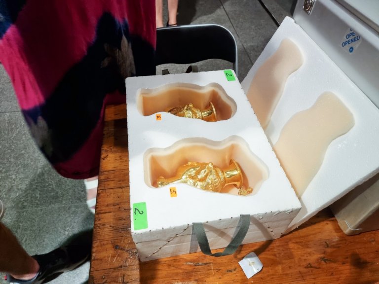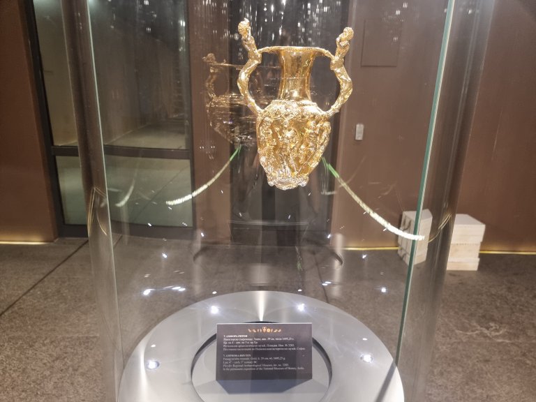 Репортер на БТА беше допуснат в трезора, докато представители на Националния исторически музей, където съкровището се съхранява постоянно, и специалисти от музея в Панагюрище поставяха оригиналните съдове на мястото на специално изработената за експозицията в Панагюрище 22-каратова реплика.