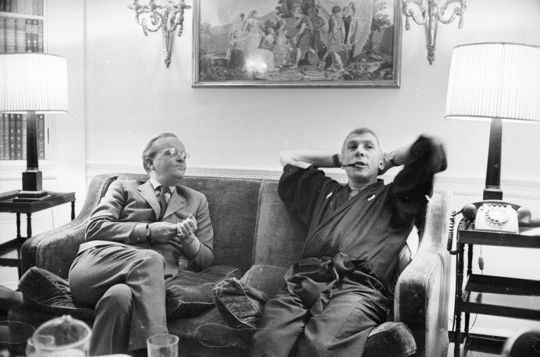20 март 1968 г.: Американският писател Труман Капоти (1924 - 1984) /вляво/ с режисьора Ричард Брукс (1912 - 1992). Година преди това Брукс режисира екранизация на книгата на Капоте „Хладнокръвно“ /Снимка: Getty Images