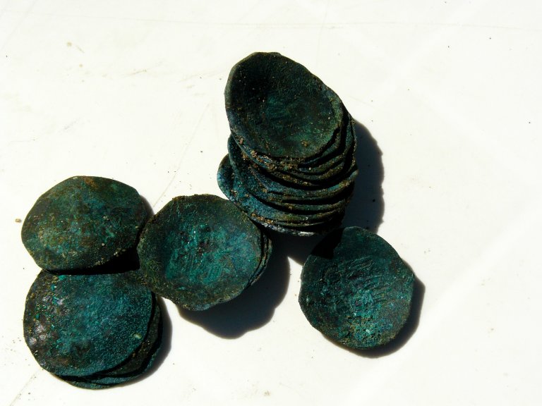 Монетно съкровище от 24 броя сребърни скифати, открито в погребение от некропола (Снимки: Архелогически музей, Созопол)