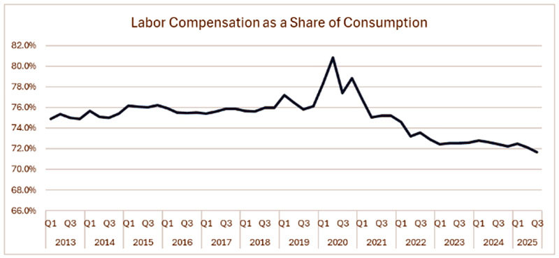 Данни показват, че в периода между 2013 г. и началото на пандемията делът на трудовите възнаграждения спрямо общото потребление в САЩ се е задържал между 75 и 76%. По време на пандемията този дял временно се увеличава заради държавните стимули и ръста на безработицата.