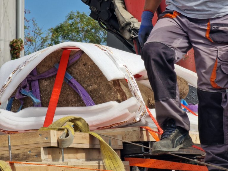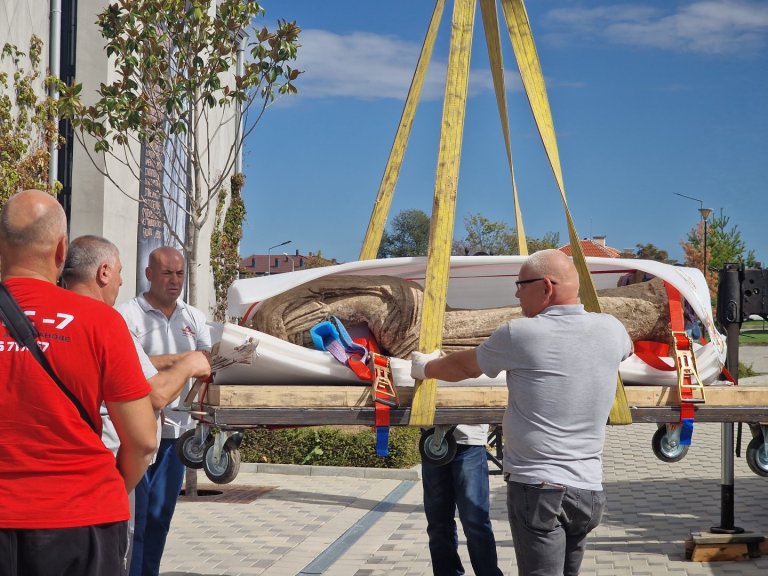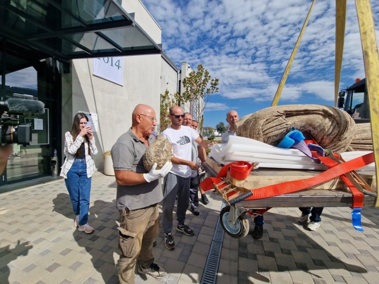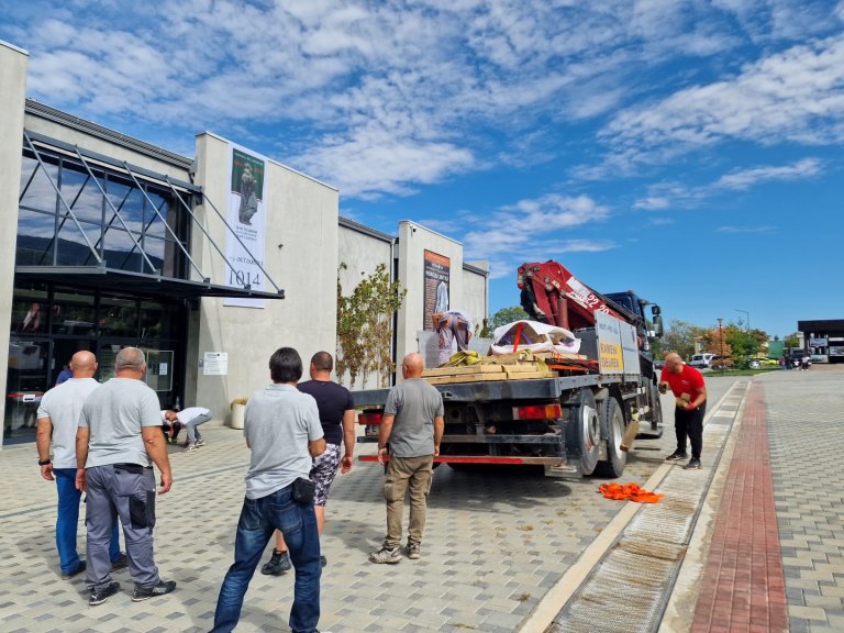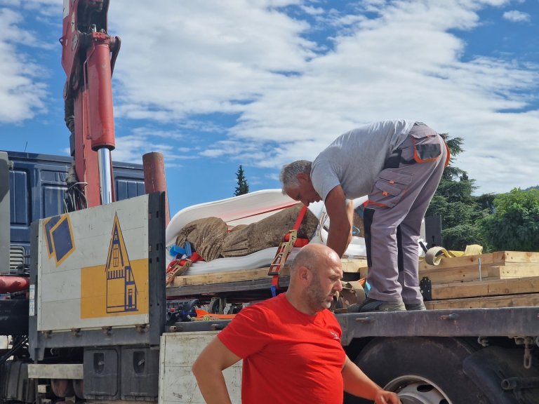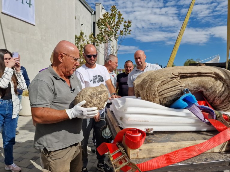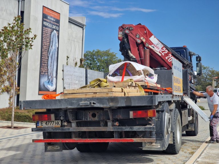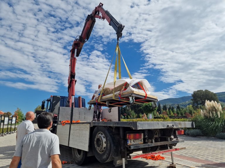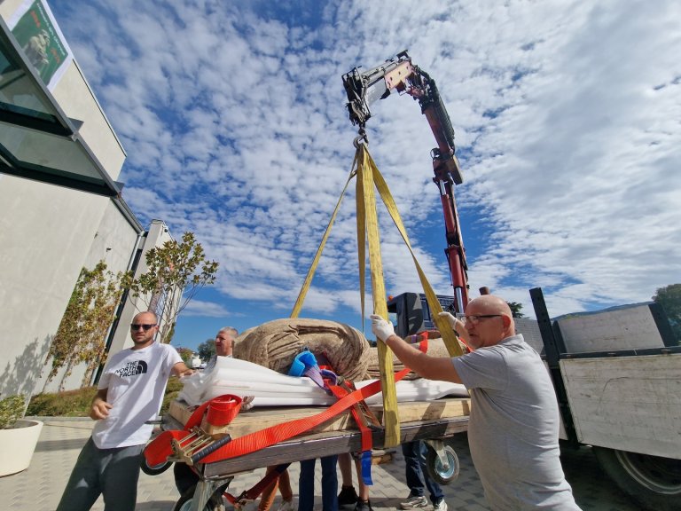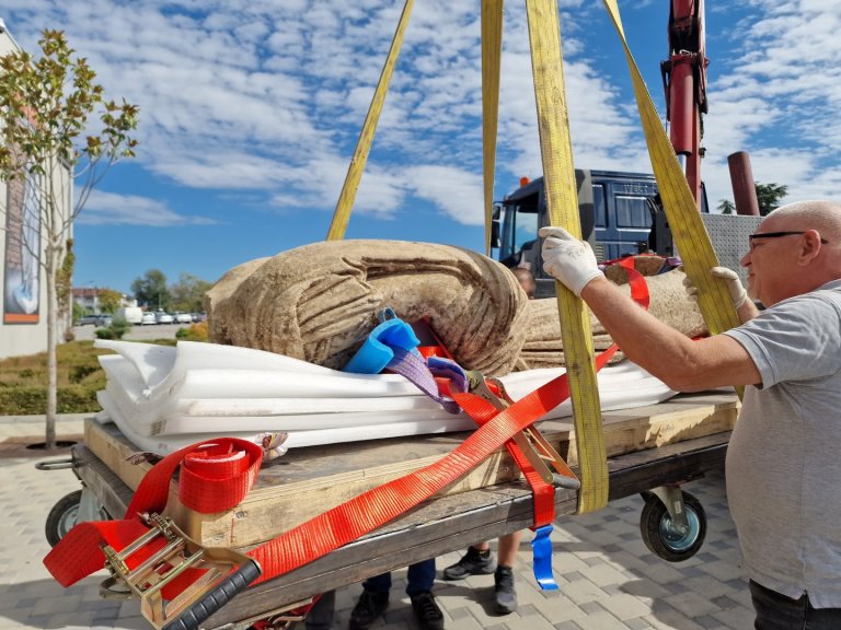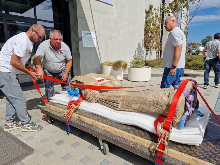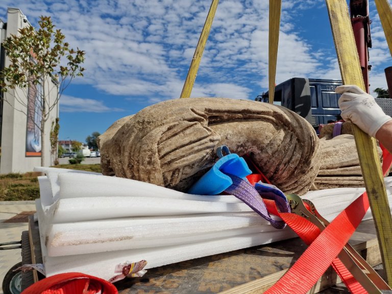Втората мраморна статуя намерена в античен град Хераклея Синтика вече е в Историческия музей в Петрич. Вчера тя беше успешно транспортирана. Снимка: Кореспондент на БТА в Петрич Евелина Митрева