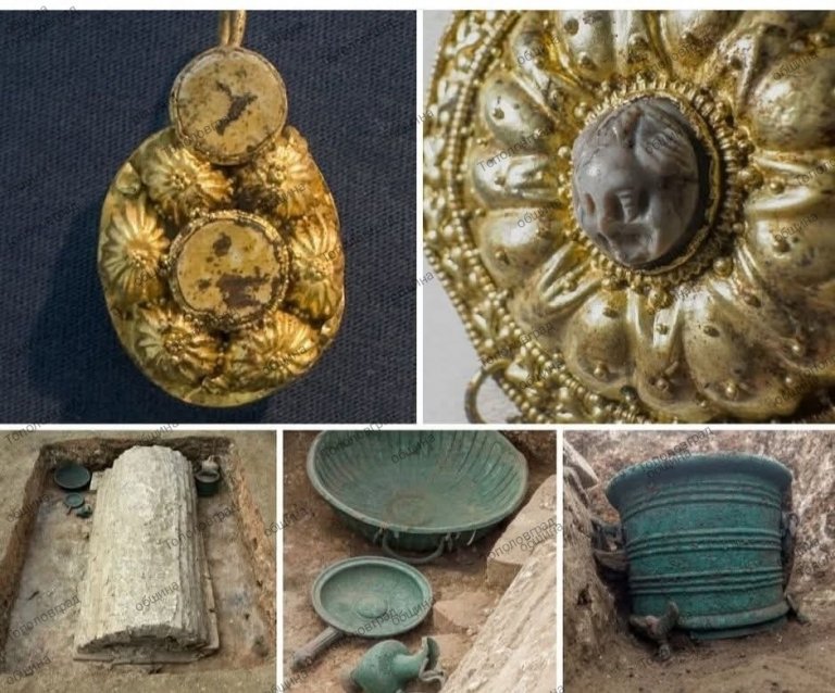 Сред находките се открояват масивни златни обеци, полусферични златни апликации, открити в областта на главата, златна аграфа-брошка с релефно женско изображение.