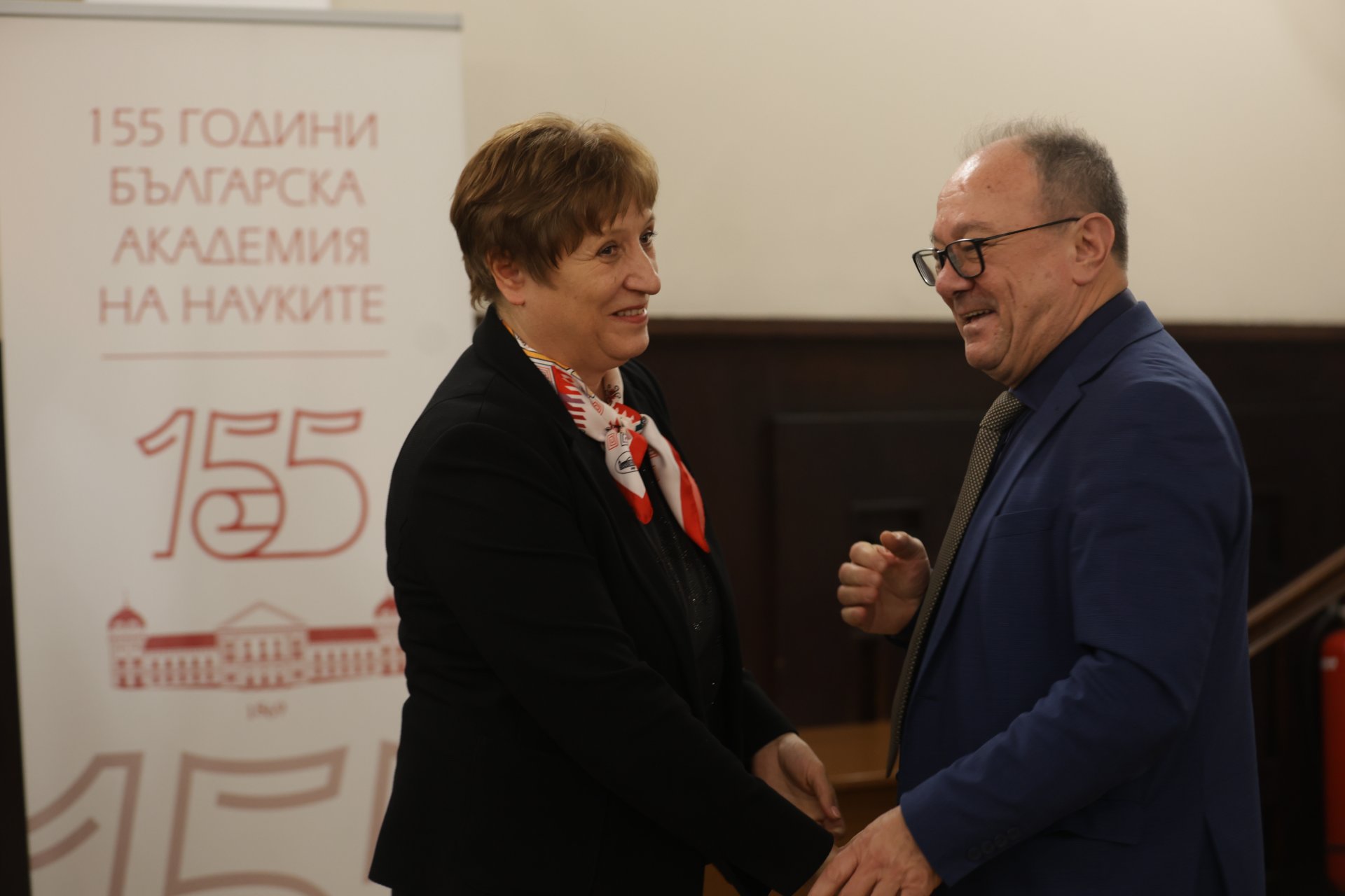 Акад. Юлиан Ревалски (вдясно) поздравява новоизбрания председател на БАН