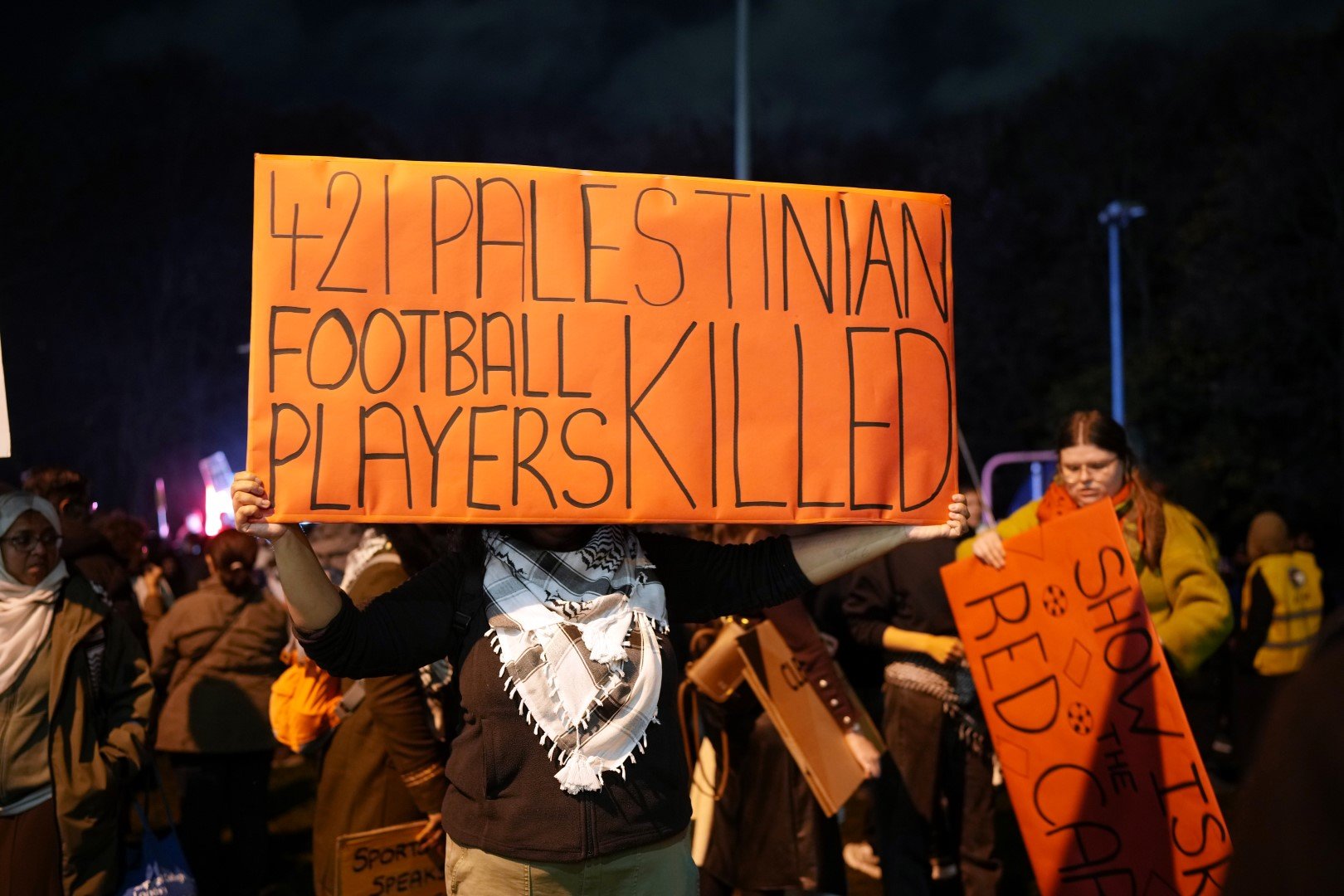 Над 2000 пропалестински демонстранти вдигнаха транспаранти, които обвиняват Израел, че е "избил 421 футболисти в Газа".