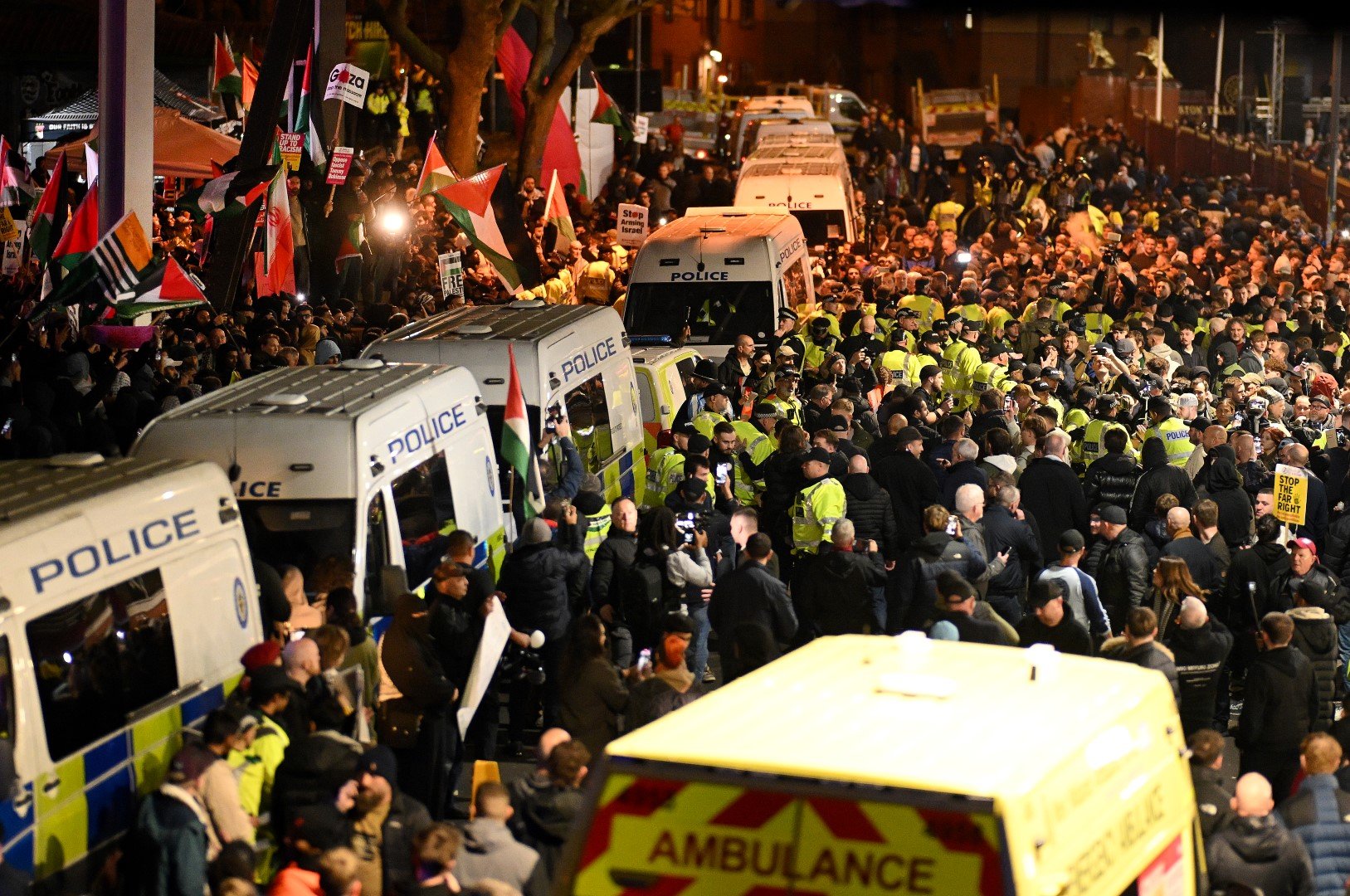 Хиляди се изсипаха по околните улици с падането на мрака преди мача, като про израелски демонстранти - около 200 според бюлетините на полицията, тръгнаха пеш към стадиона със знамена, въпреки че знаеха, че няма да бъдат допуснати вътре. Тяхното шествие мина мирно, но от другата страна на стадиона изобщо не бе толкова спокойно.